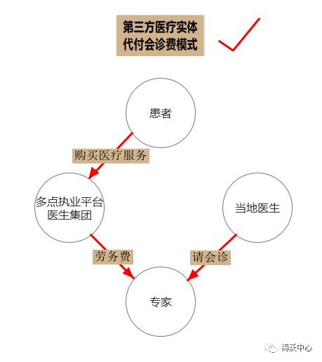 ▲ 第三方机构代付会诊费模式 公立医院的医生,属于体制人。在市场浪潮中,身怀绝技的体制内医生在彰显价值的过程中,自然有着很多的限制。随着分级诊疗和多点执业政策的不断深入,对于专家资源的需求也是越来越旺盛,相应的第三方医疗服务机构也在近年出现了爆发式增长。